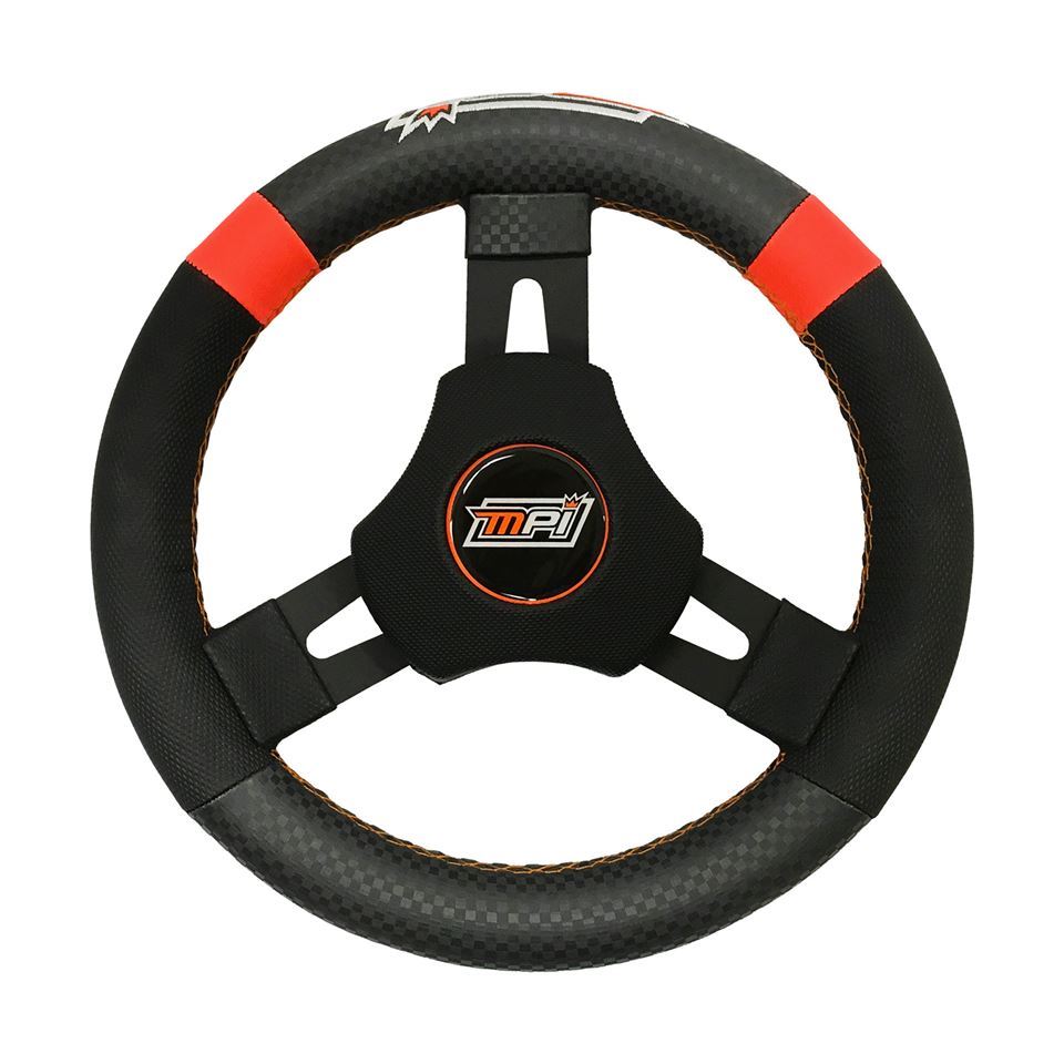 Covered in 3 different dirt friendly/washableSynthetic materials: Lederfylon high-grip, orange synthetic, carbon syntheticHole pattern: 3 holeHand swen crossed orange stitching for unique look/durabilitySlotte spoke for reduce weightMPI Centerpiece included