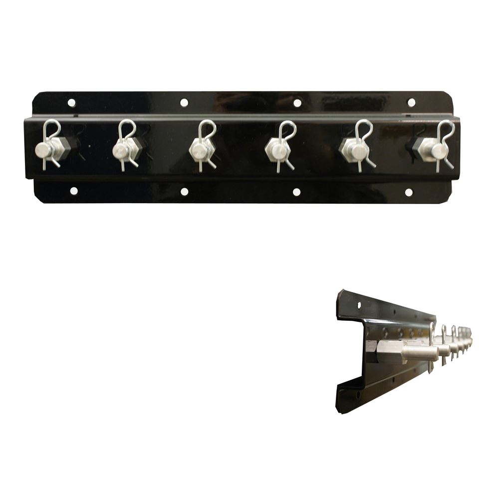 WALL SHOCK MOUNT SINGLE ROW 15"Aluminum mount with pins holds up to 6 shocks in your trailer or at the shopBlack Powder Coat finish. Custom color powder coated available at customer request.Sold eachOrder two mounts and secure both the top and bottom of your shocksShocks shown in pictures are not included.